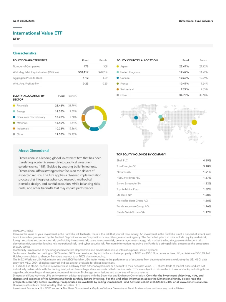 The investment objective of the Dimensional International Value ETF (DFIV) is to achieve long-term capital appreciation while minimizing federal income taxes on returns. It uses reliable information in prices to target higher expected return securities within value stocks and is implemented with a daily flexible process to maintain consistent exposure through time.