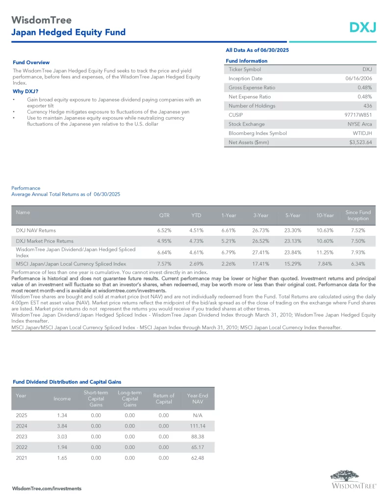DXJ | 2006-06-16 | 0.48% | $3,023,020,680 | 444 | 0.45 | 11.18 | 3.13% | Quarterly | 55.11% | 26.50% | 19.51% | 13.32% | 11.47% |