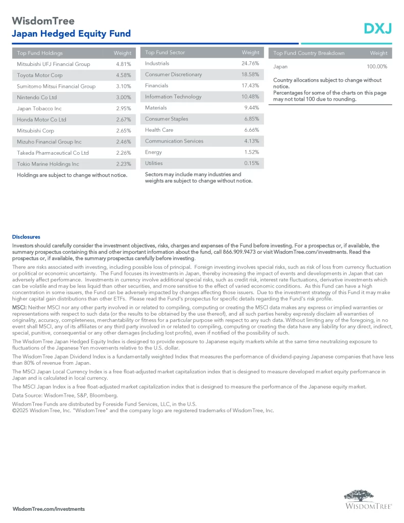 WisdomTree Japan Hedged Equity Fund seeks to provide exposure to the Japanese equity market while hedging exposure to fluctuations between the U.S. dollar and the yen.
